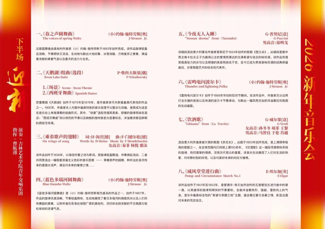 在上半场以中国民族管弦乐铺陈的【硕果】篇章,吉林艺术学院青年国乐团精选了学校2025年部分年度成果与优秀校友佳作,彰显一年以来学校的办学成效与扎实积淀;在下半场以交响乐奏响的【迎新】乐章,吉林艺术学院青年交响乐团将演绎《蓝色多瑙河圆舞曲》《威风堂堂进行曲》等西方经典曲目,中西乐韵交相辉映,共同呈献一场兼具艺术质感与情感温度的年度音乐佳宴。