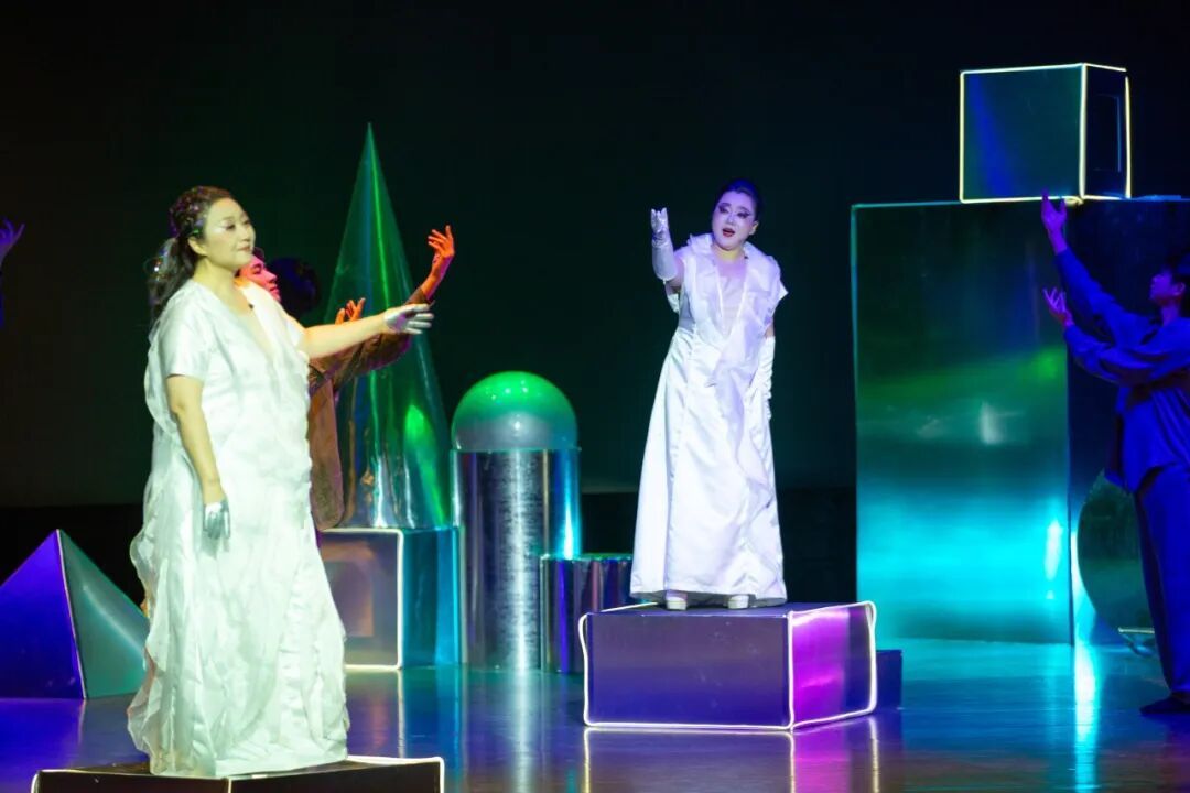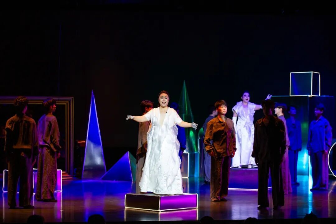 这场原创盛宴的背后,是跨学科融合的坚实力量。创作团队由音乐学院、舞蹈学院、新媒体学院、设计学院与艺术展演中心多位教师组成,开启了一场跨界探索。新媒体学院李俭老师担任视觉总监,将前沿技术与舞台美学结合,打造出兼具梦幻感与叙事性的视觉空间;设计学院王志惠武老师与研究生郭武主导服装设计,让角色造型与性格特质完美契合;艺术展演中心张起老师以精准的光影调度勾勒舞台层次,用明暗变幻烘托剧情氛围,为每一幕场景注入灵动的情绪张力。