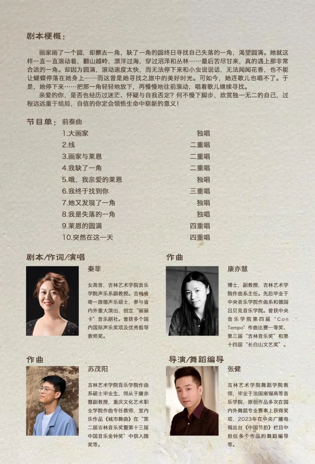 从剧本创作到旋律谱写,从舞蹈编排到视觉设计,每一个环节都烙印着吉艺人的原创基因。2020年,作为吉林艺术学院校级科研项目,《失落的一角》正式启动。剧本由音乐学院教师秦菲撰写,她以“缺角的圆”为隐喻,勾勒出关于自我探索的深刻命题;作曲系主任康亦慧与硕士生苏茂阳携手,将细腻的情感融入音符,让旋律成为故事的第二语言;舞蹈学院张健老师深耕编舞,用肢体动作诠释角色的迷茫与觉醒,每一个舞姿都经过反复推敲。