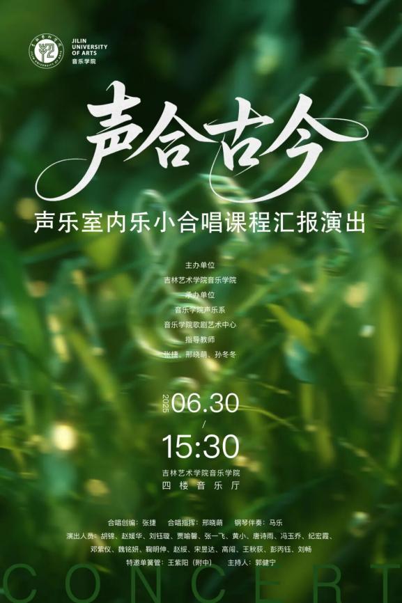 6月30日,吉林艺术学院音乐学院歌剧艺术中心“声合古今”——声乐室内乐小合唱课程汇报演出于四楼音乐厅成功举办。本次音乐会作为声乐表演专业重要的教学实践环节,集中呈现了《锦瑟》《世界赠予我的》《青玉案·元夕》等风格多元的合唱作品,展现了学生们阶段性的专业学习成果。